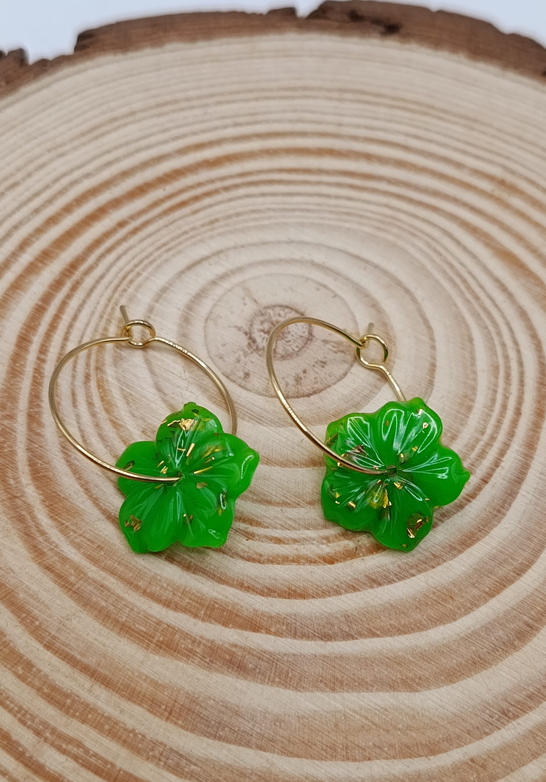 Flores verdes con aretes de acero inoxidable color dorado.