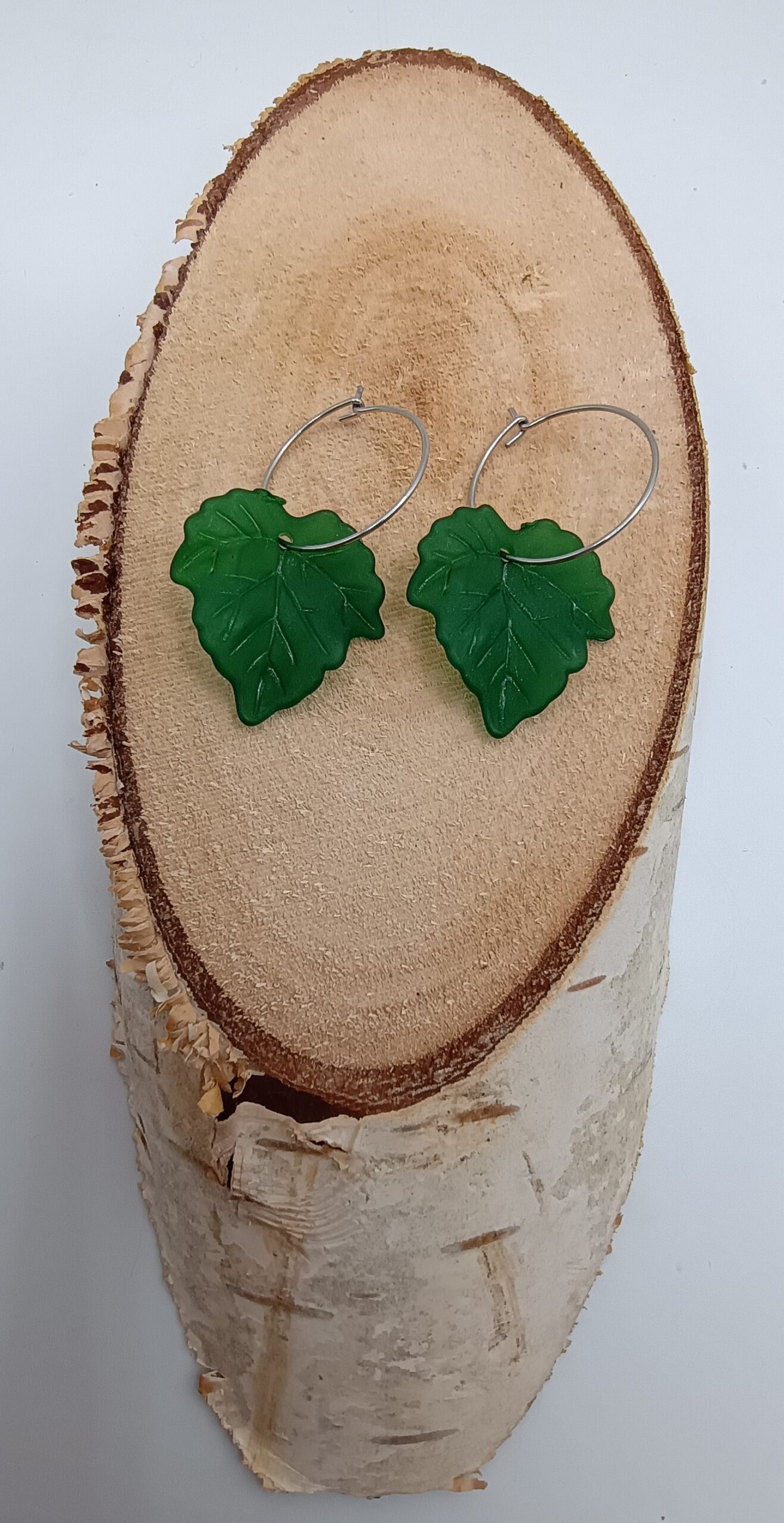 Hojas verde oscuro con aretes de acero color plateado