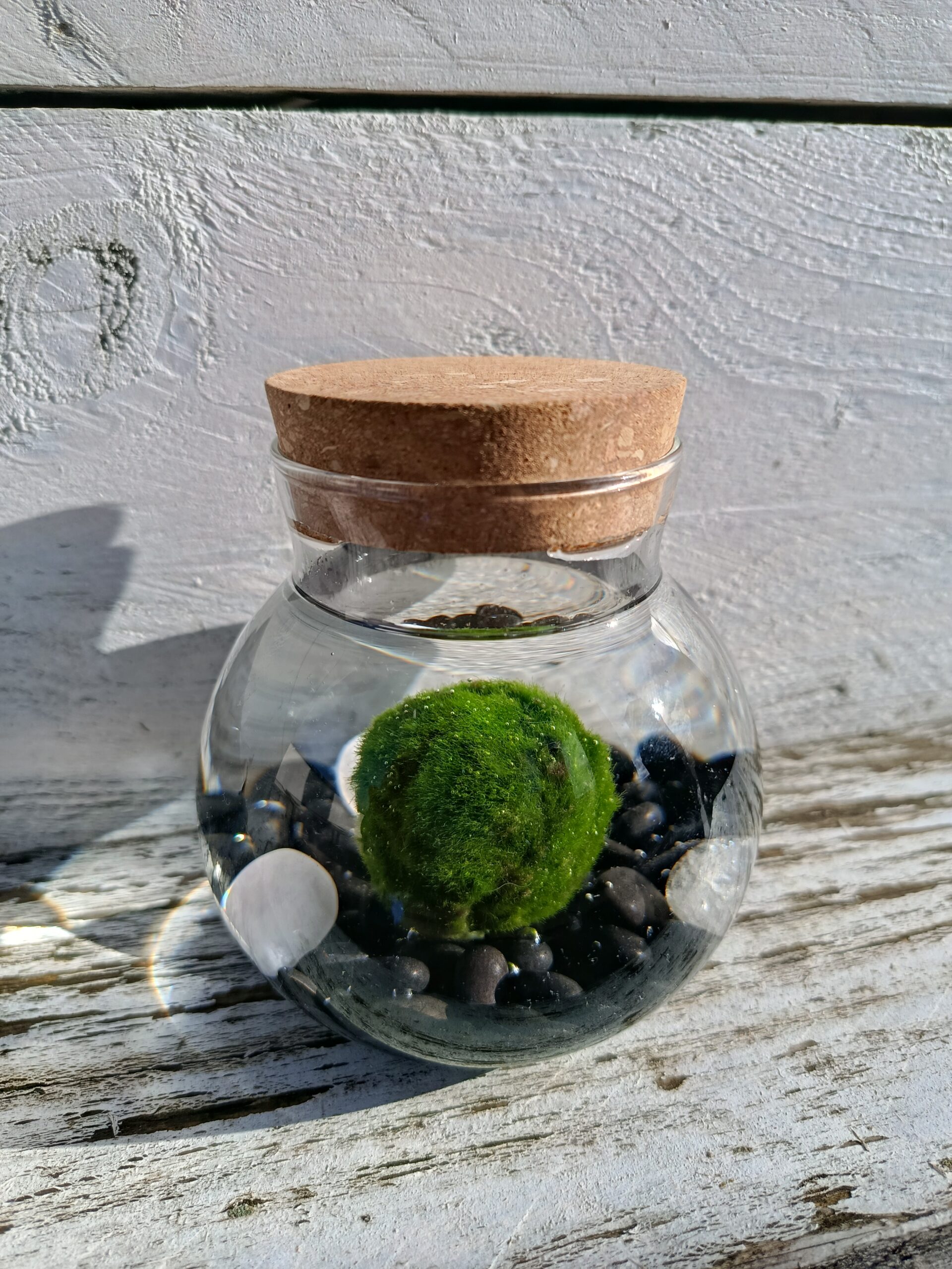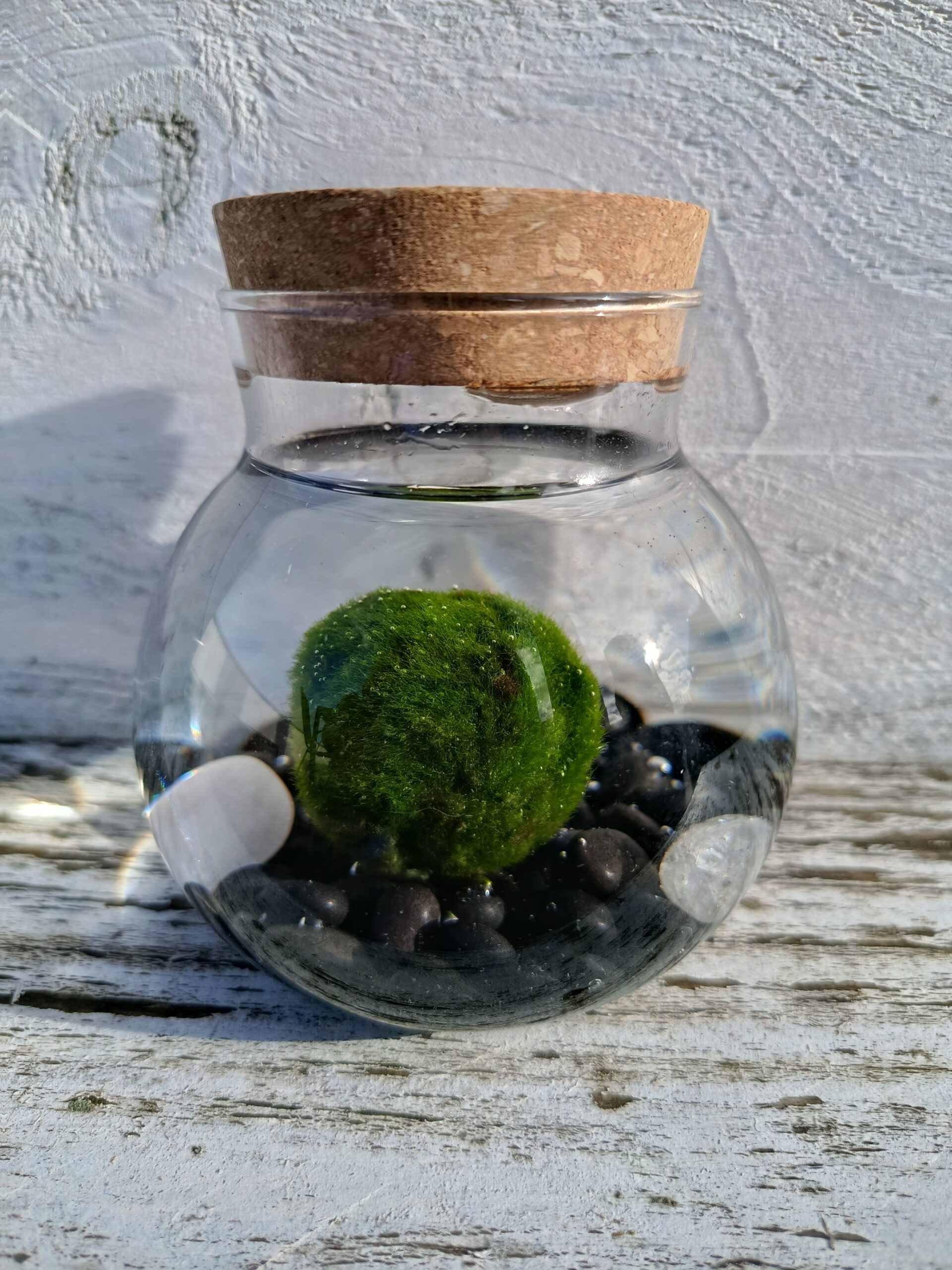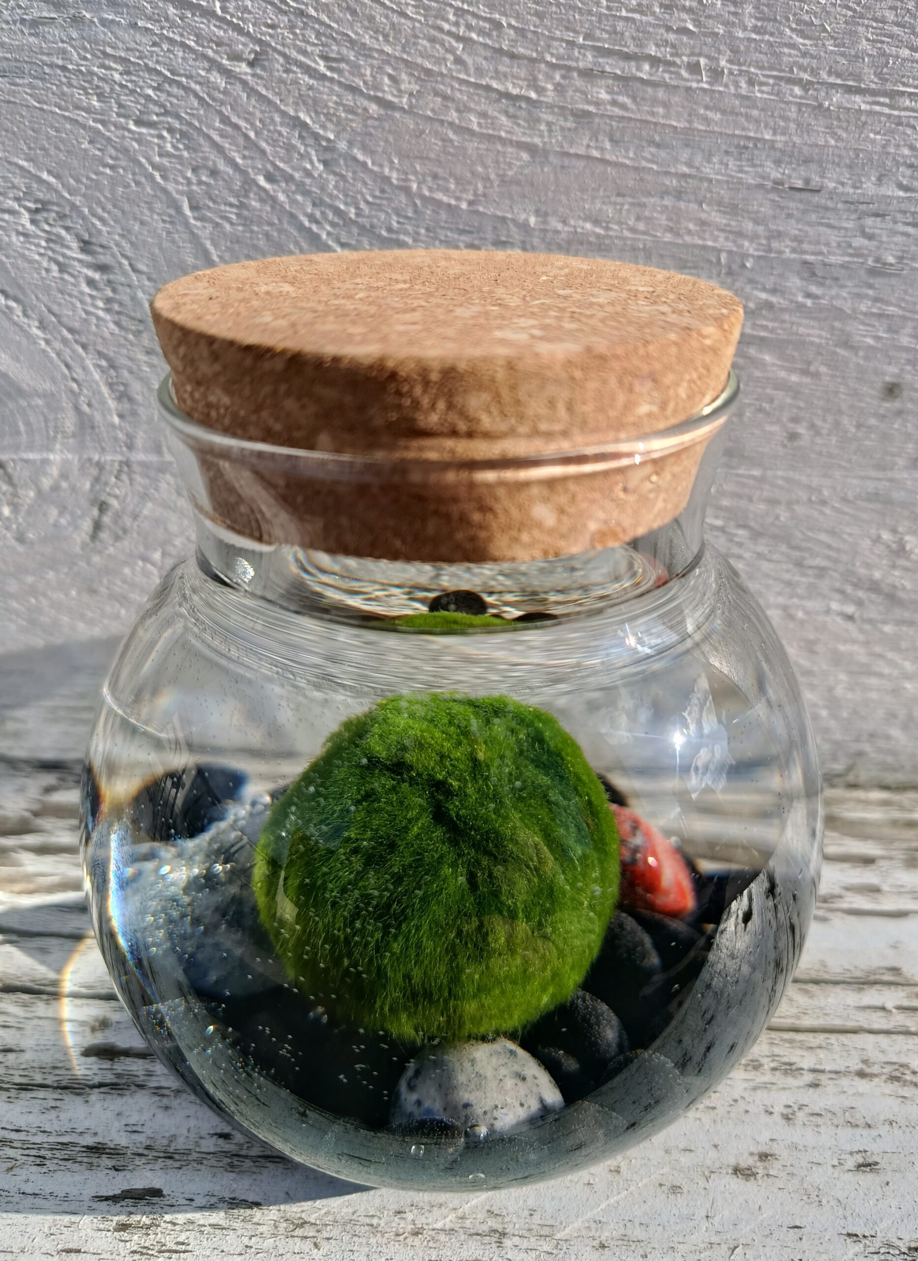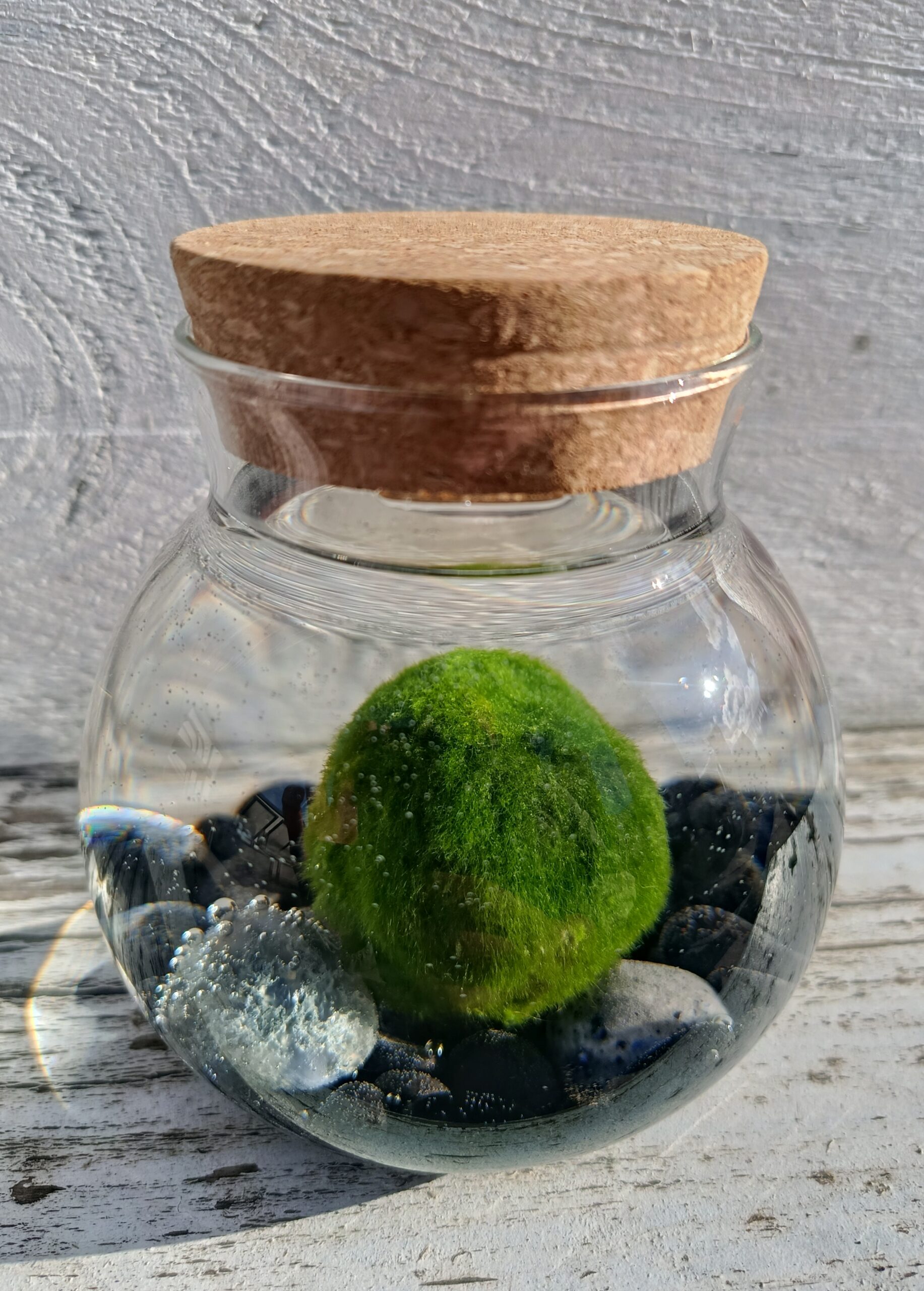 El kit incluye: 1 marimo de unos 3 cm, un recipiente de cristal de 6 cm con capacidad para 50cl y piedras decorativas.