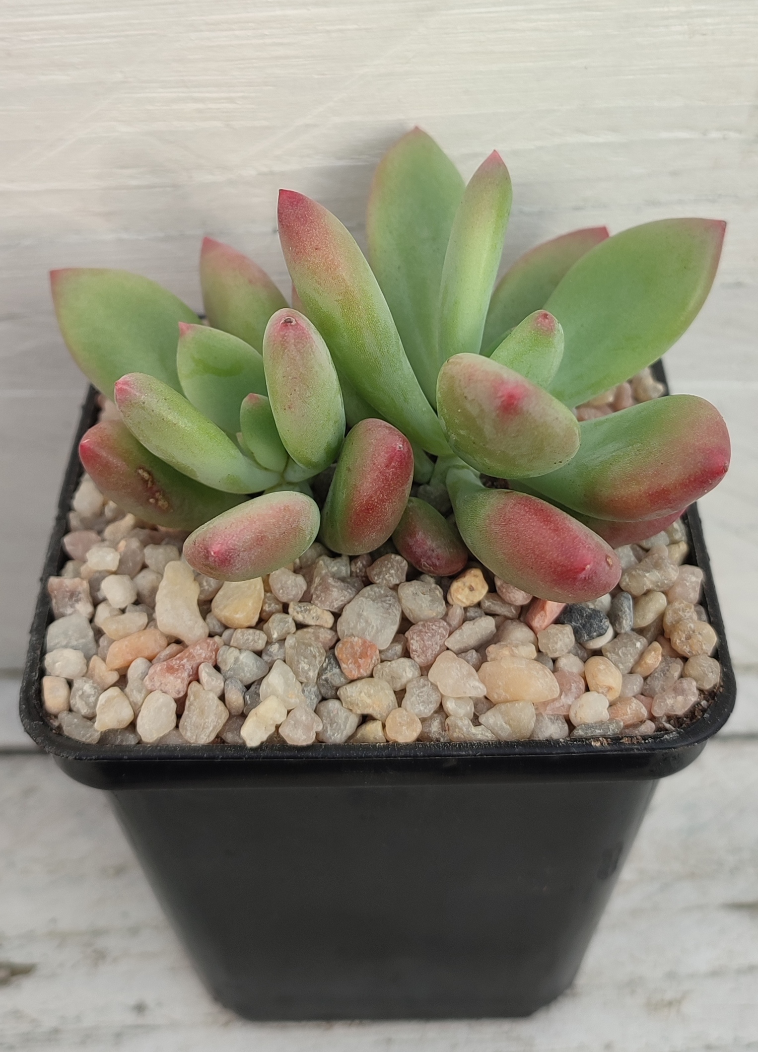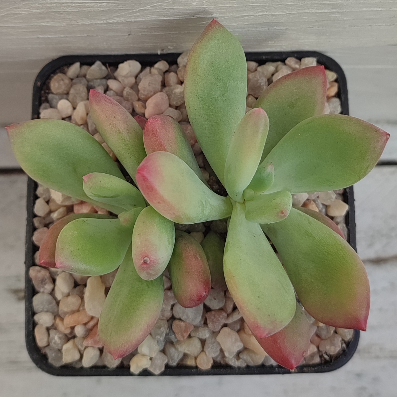 Las pachyverias son híbridos de Echeveria x Pachyphytum. Esta pachyveria cuenta con hojas largas y carnosas cuyas puntas y envés son de color rosado.